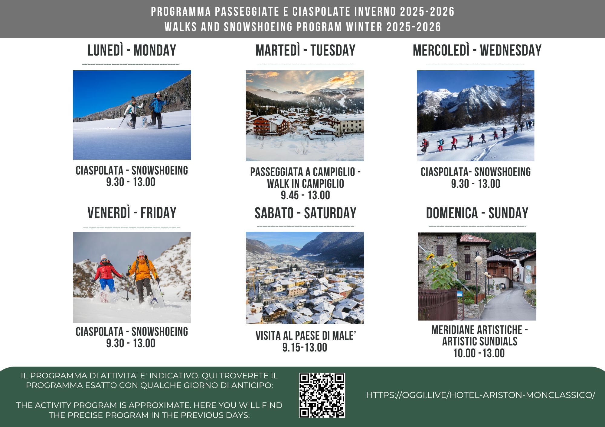 Wenn es schon immer Ihr Traum war, die verschneiten Landschaften der Dolomiten zu genießen, dann können Sie ihn im Hotel Ariston wahr werden lassen. Die zentrale Lage unseres Hotels ist ideal sowohl für Skifahrer als auch für diejenigen, die sanfte Aktivitäten wie Wandern und Schneeschuhwandern bevorzugen.